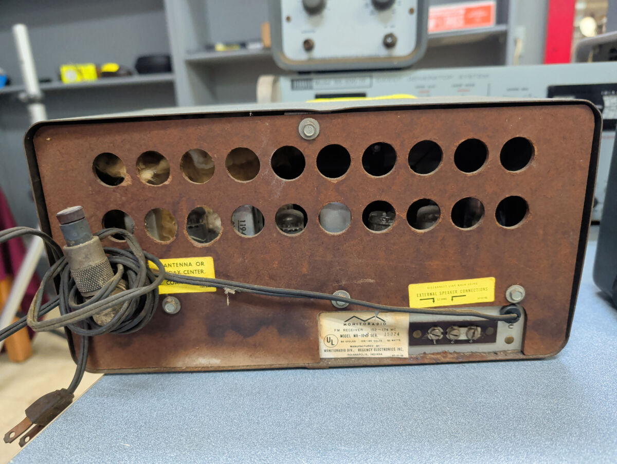 Regency MR-10 Monitoradio FM receiver with volume, squelch, and tuning knobs.