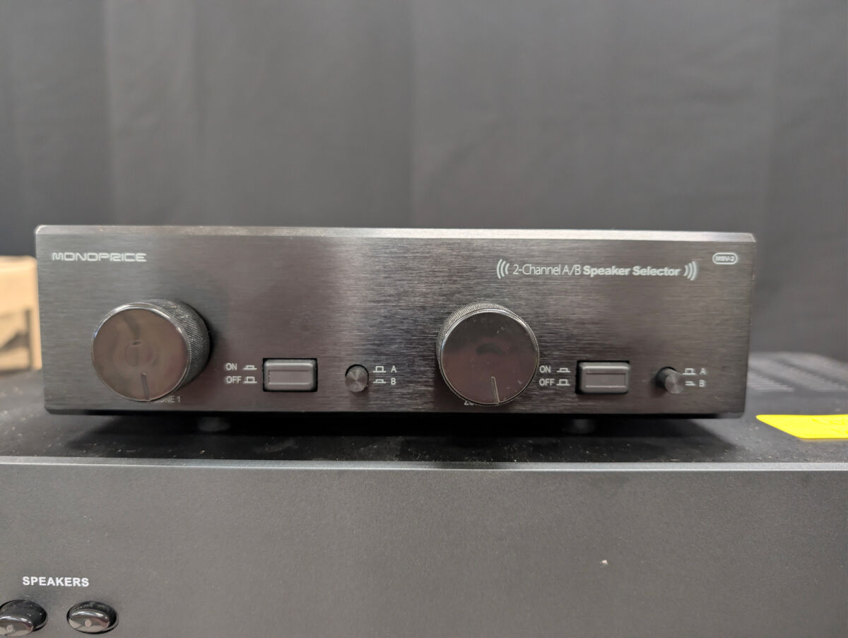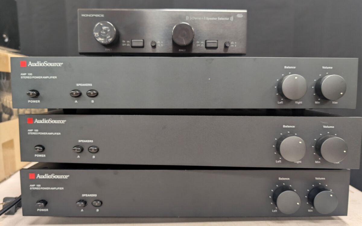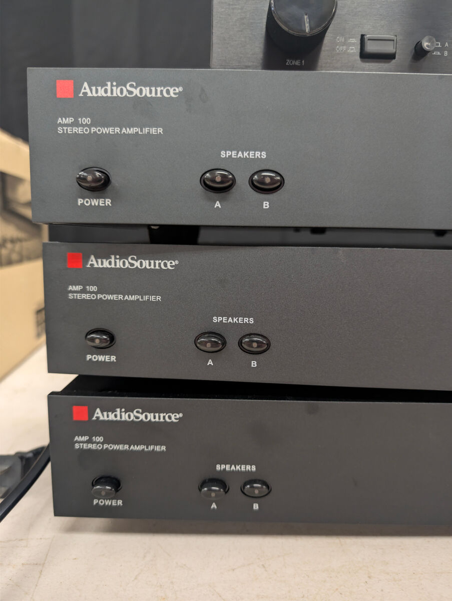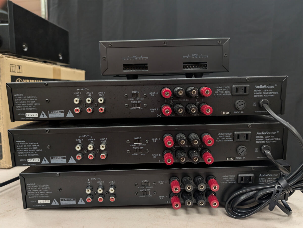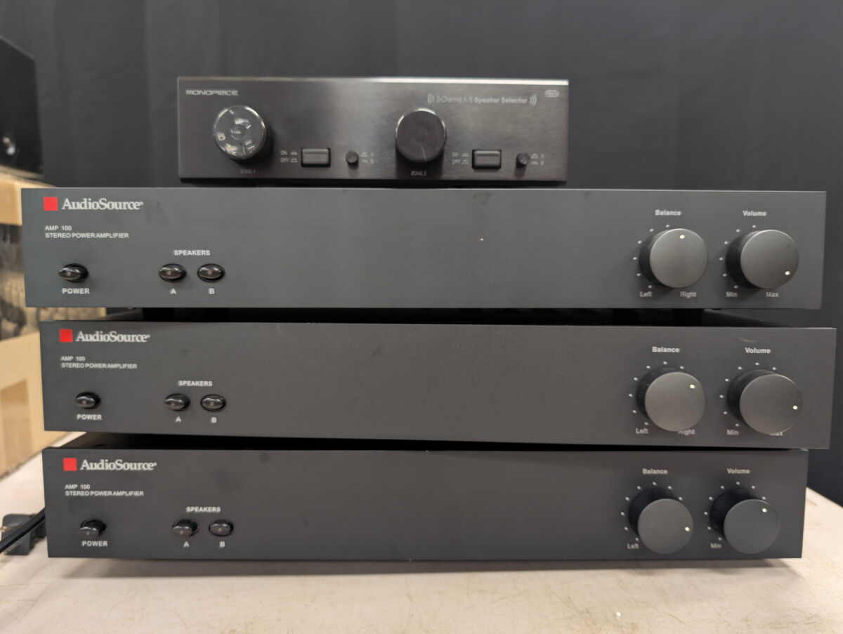 Includes three AudioSource AMP 100 stereo power amplifiers and one Monoprice 2-Channel A/B speaker selector. All items are black.