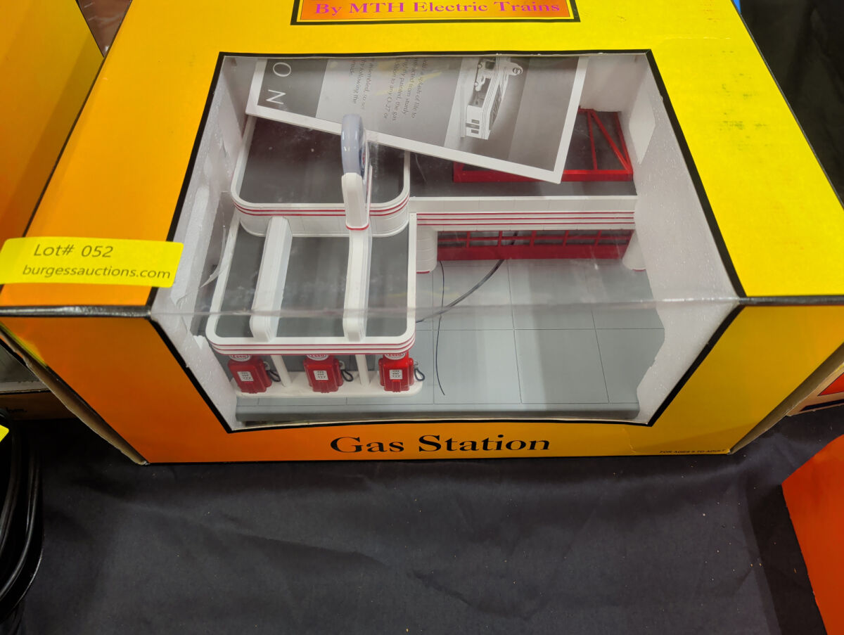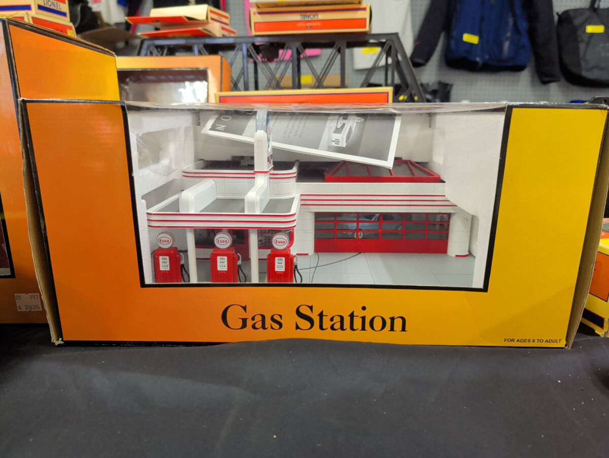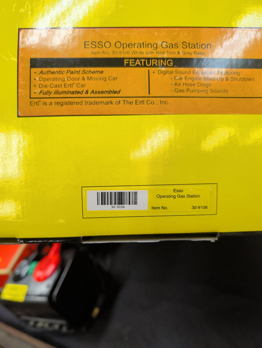 ESSO Operating Gas Station Item No. 30-9106 with Red Trim and Gray Base. Features operating door and moving car, die-cast car, fully illuminated and assembled, and digital sound equipped featuring car engine start-up and shutdown, air hose dings and gas pumping sounds.